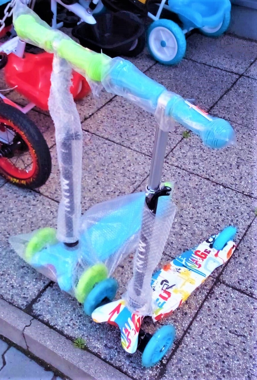 Trotinetă ușoară pentru copii SCOOTER MINI are 3 roți pentru o stabilitate mai bună, care sunt echipate cu leduri care se colorează în diferite culori, când se merge pe ea. Mersul pe trotinetă ajută copiii să-și dezvolte abilitățile motorii, să-și coordoneze mișcările și să-și mențină echilibrul. Datorită celor două roți din față, care au o lărgime mai mare decât restul trotinetei, este mai ușor pentru copil să mențină echilibrul decât pe o trotinetă obișnuită cu o singură roată în față.
