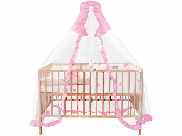 - erre a támaszra egy fátyol vagy más anyagú fuggonykorona kerül telepítésre, amely megvédi a csecsemőt és békés alvást biztosít neki