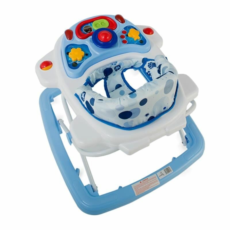 Állítható magasságú, játékkal és zenélovel ellátva, muanyag kerekekkel.
