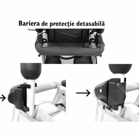 Plierea este atat a cadrului, cat si a scaunului. Scaunul este prevazut cu centura de siguranta cu prindere in 3 puncte si cu bara de protectie ce se poate detasa. Scaunul se poate ajusta dupa bunul plac atat pozitia sezutului, cat si a spatarului.