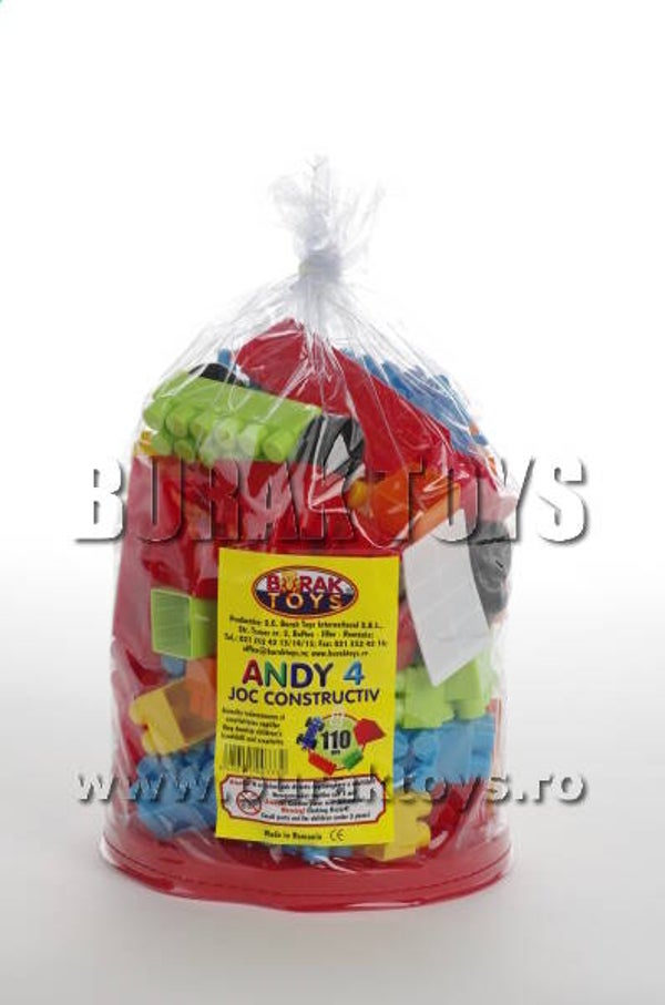Joc constructiv Andy contine 110 piese impreuna cu un saculet pentru depozitare.. Piesele pot fi asamblate prin intermediul a 4, 6, 8, 10 sau 12 spatii de imbinare care, impreuna cu piesele speciale, permit construirea unor forme diverse imaginate de copii.