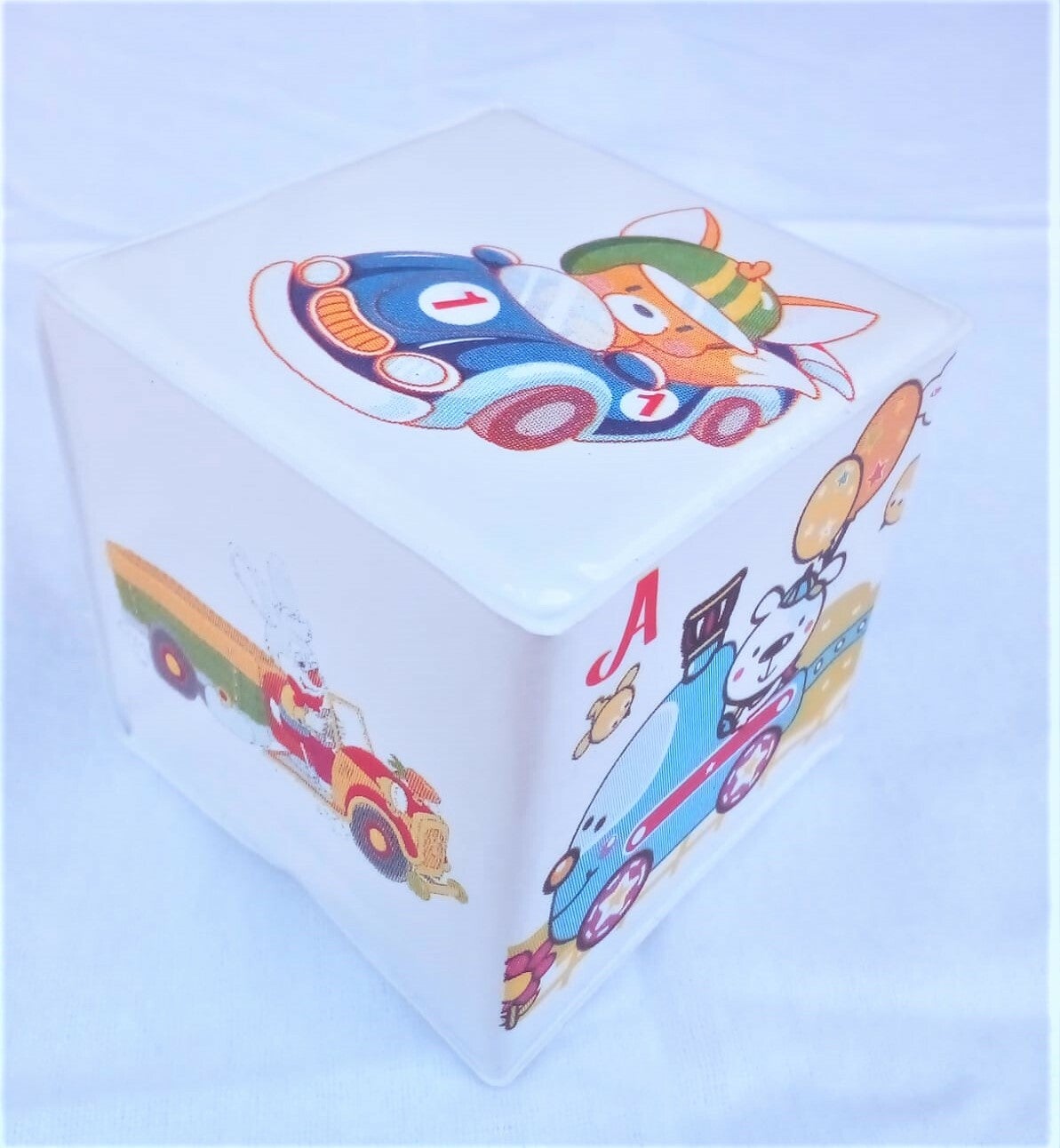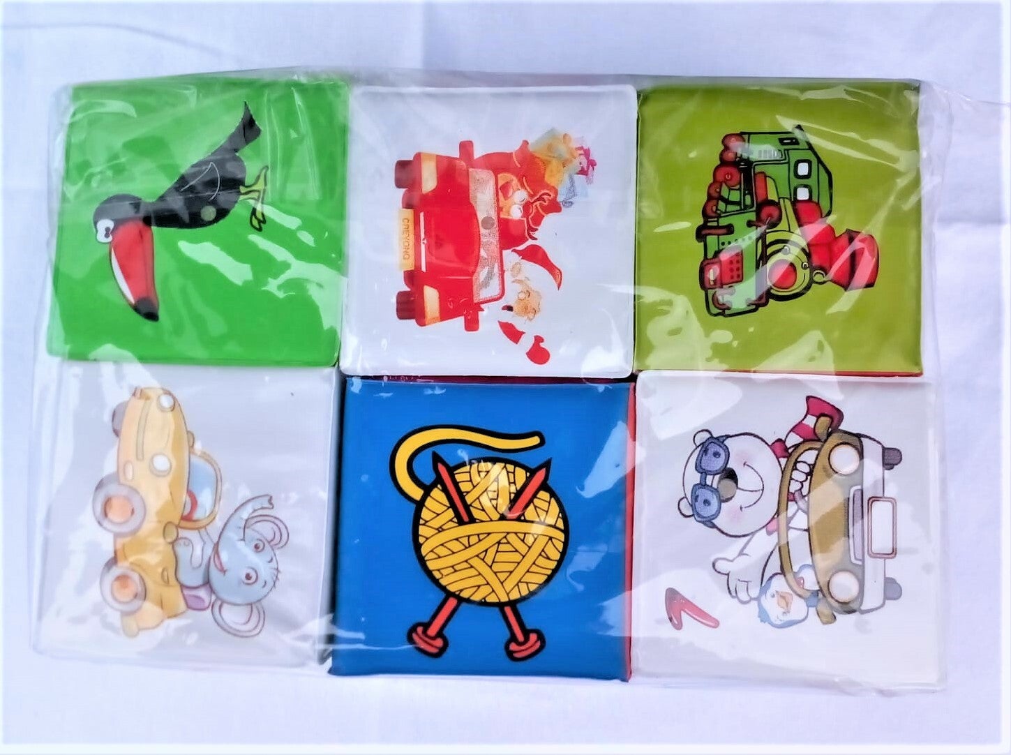 Setul de cuburi este format din 6 cuburi de tesaturi pline de culoare spumoase, moi si usoare pentru stoarcere, aruncare si construire. Pentru siguranta copilului tau cuburile pot fi spalate in masina de spalat.