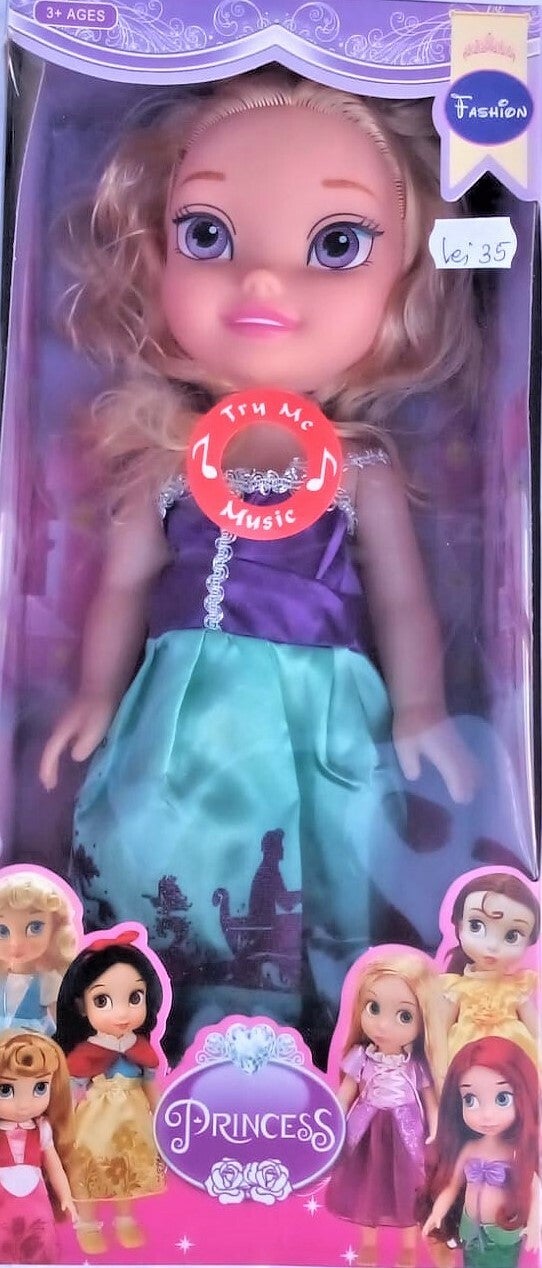 Papusa printesa confectionata din plastic si cauciuc in zona capului. Papusica este alegerea ideala pentru orice fetita careia ii plac printelese, ea are un lantisor cu un diamant pe piept care apasat va canta. Papusica este usor de purtat de copii avand 35 de cm inaltime.
