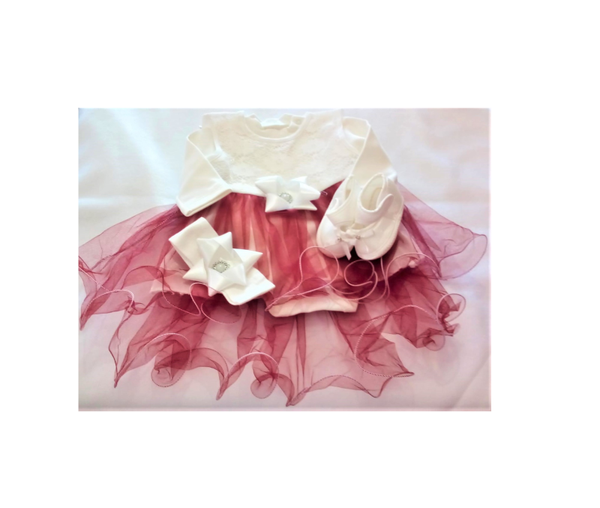 A szett 4 részbol áll: body, kotényszoknyácska, hajpánt és cipocske.
