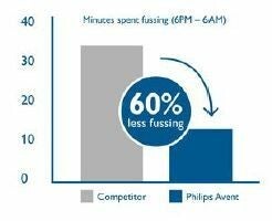 Biberonul Philips Avent Classic+ reduce agitatia. Bebelusii hraniti cu biberoane Philips Avent Classic+ au fost cu 60 % mai putin agitati in timpul noptii decat bebelusii hraniti cu un biberon anti-colici produs de concurenta.
