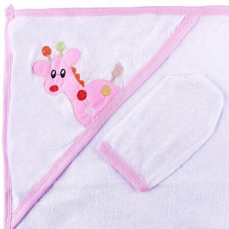 Prosop baie cu capison si manusa bebe, alb/roz.