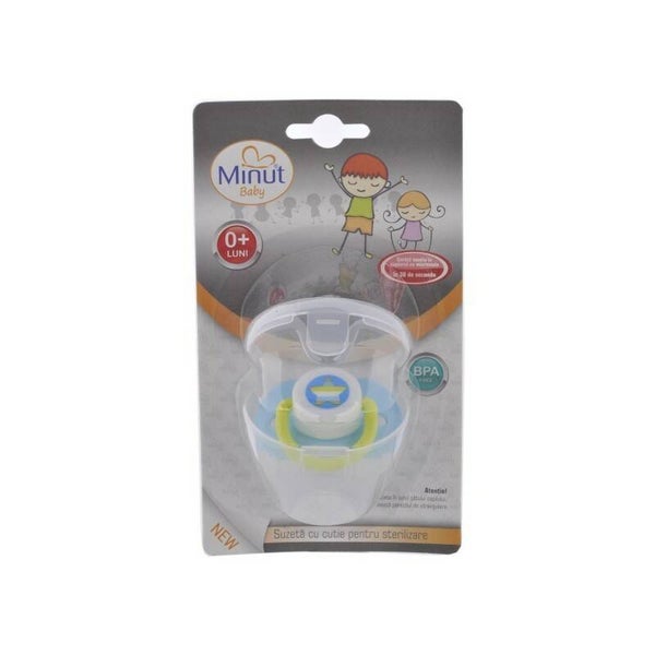 Setul contine o suzeta si o cutie pentru pastrare si sterilizare. Disponibila în patru variante de culori.