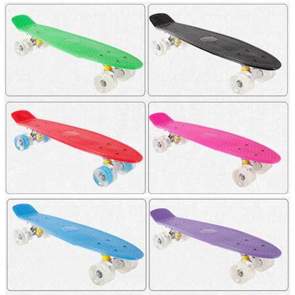 - Prin intermediul a opt LED-uri colorate, acest model de skateboard cu roti colorate, portocalii si verzi, va deveni rapid preferatul copiilor.